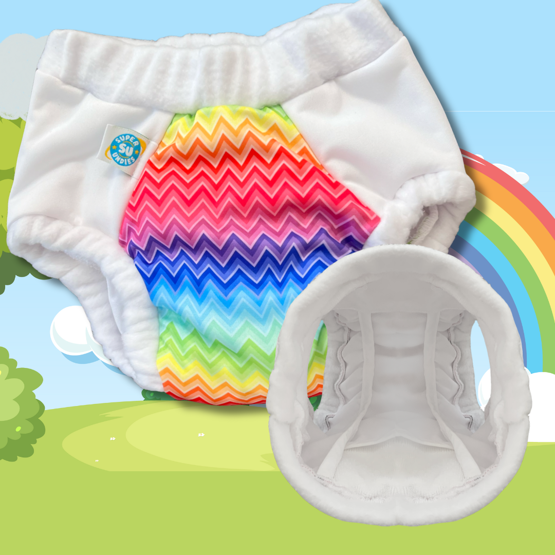 Small: 18-20" Waist | 12" Legs | 30-45 lbs | Typical Age 3-5y | Absorbs 325 ml without added inserts