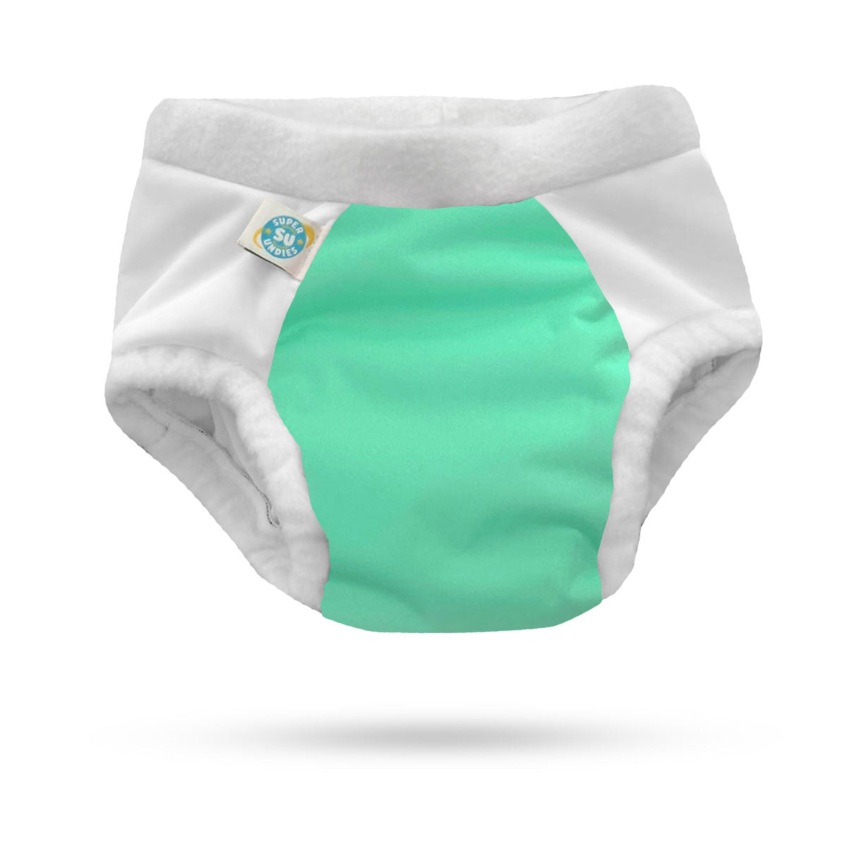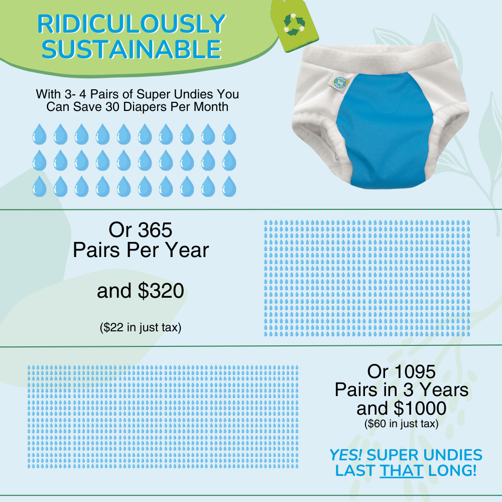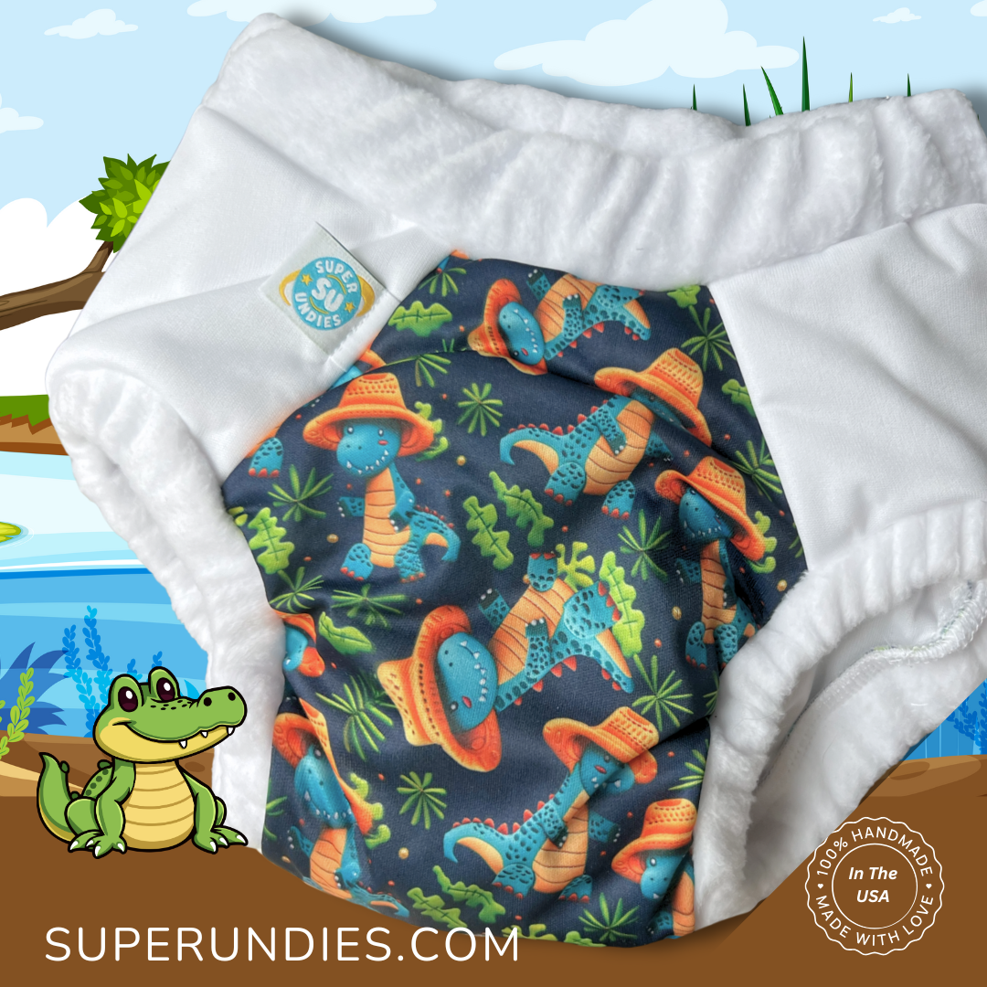 *Strong Waterproofing* Super Undies are made with PUL, which is a thinly laminated non-wicking fabric. PUL has a soft drapey feel to it, is waterproof in nature, but allows more breathability than disposable diapers. Waterproof gussets line the legs of these Undies, locking in the wetness.